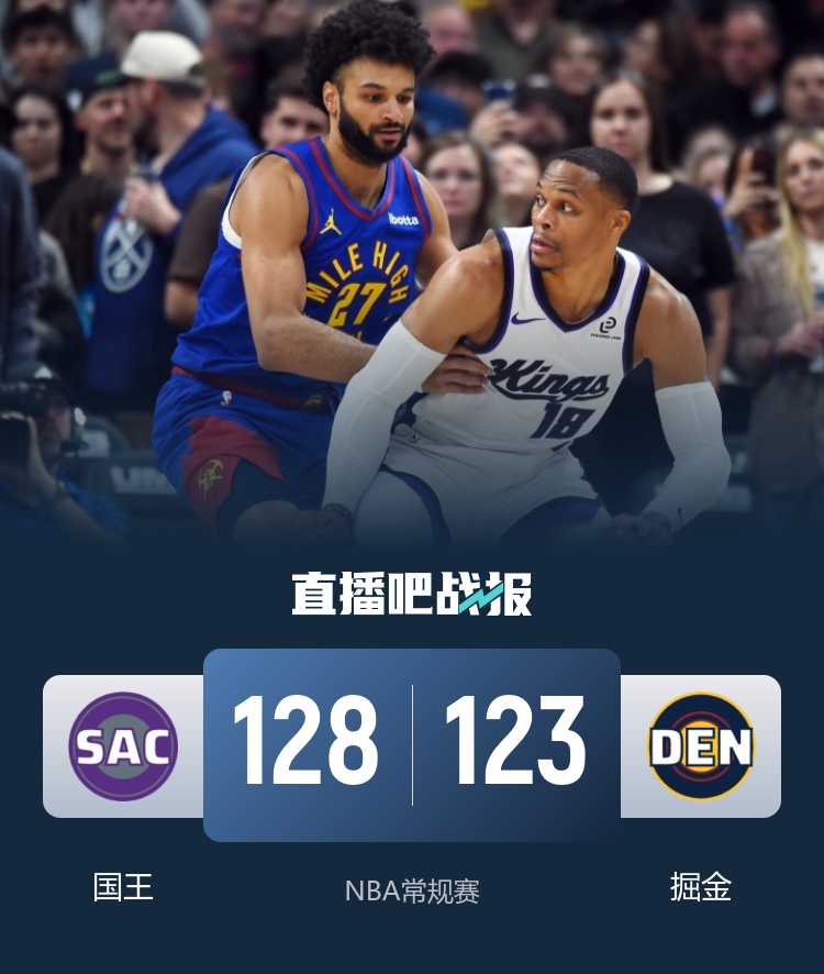 一开场,双方很快陷入缠斗,比分始终紧咬,威少得分助攻一肩挑,掘金外线开炮连续飙中三分还以颜色,施罗德三分穿针,沃特森和贾马尔·穆雷联手拿分率队占据主动,次节国王轮番冲击内线频频得手,约基奇传射建功强势回应,国王多点开花,半场战罢掘金65-61领先国王。下半场,掘金占得先机打出12-2获得两位数优势,基根·穆雷挺身而出连得8分带队迅速迫近比分,施罗德单节12分带队反超,末节威少接管比赛,内外开花连得7分,约基奇里突外投带队追赶,威少开启无敌模式,三分命中后负角度跳投还有,约基奇三分续命,德罗赞关键2+1后约基奇三罚都有,德罗赞两罚全中杀死比赛。最终,国王128-123力克掘金,结束了自己的8连败。