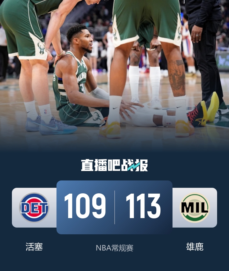 比赛开始,字母哥因伤返回更衣室,活塞率先发力打出17-4的开局,小波特挺身而出,连投带罚带队追赶,次节活塞命中率下降,雄鹿趁势反击打出10-0的攻击波迫近比分, 半场战罢活塞52-49仅剩3分优势。易边再战,特纳三分率队反超,随后惊天隔扣斯图尔特,双方陷入苦战,斯图尔特和波蒂斯发生摩擦被1T驱逐,活塞内外开花占据场上主动,末节雄鹿大举反击,AJ·格林连中三分率队完成12-2的攻击波反超比分,此后双方争夺陷入白热化,关键时刻康宁汉姆三分不中,最终,雄鹿113-109逆转活塞。
