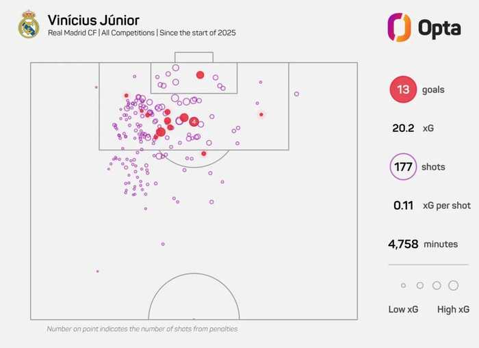 据Opta数据统计,自2025年1月起截至目前,在“各项赛事”范围内,皇马前锋维尼修斯在西甲球员中出现了最明显的“进球数低于预期进球(xG)”现象:他一共打进他一共打进13球,但对应的预期进球(xG)为20.2。两者差值达到-7.2,为西甲球员最差。