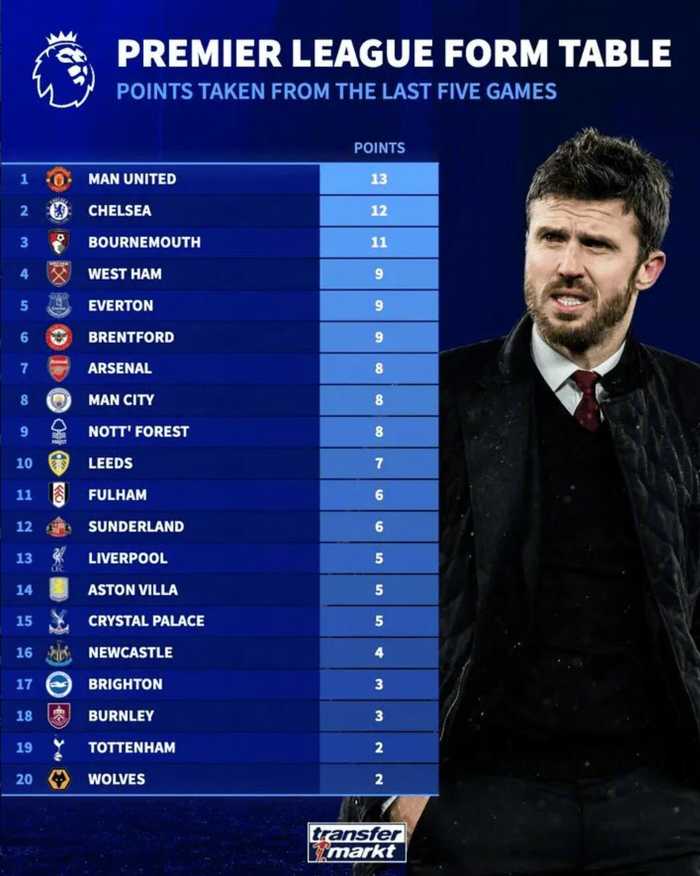 德转发布英超球队近期状态榜(近5轮拿分):曼联以13分领跑,成为过去五轮抢分效率最高的球队;切尔西12分紧随其后,伯恩茅斯以11分位...