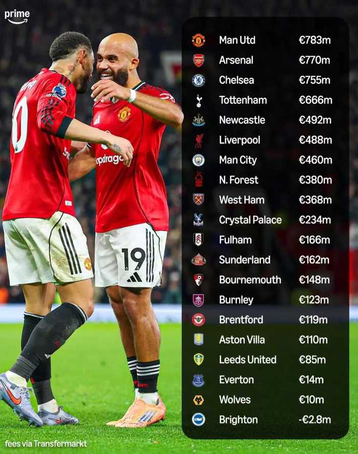 Prime Video Sports发布了过去五个赛季英超俱乐部的净支出统计数据。曼联以7.83亿欧元的净支出位居榜首,成为同期投入最大的球队,...