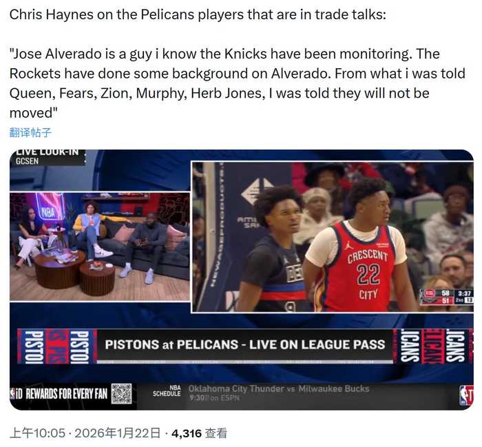 Chris Haynes谈鹈鹕: “尼克斯一直在关注阿尔瓦拉多,火箭也对阿尔瓦拉多做了一些背景调查。据我所知,奎因、费尔斯、锡安、墨...