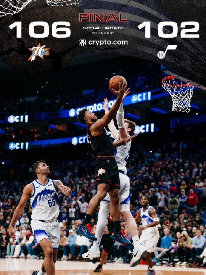 在连续输给绿军和马刺这两支强队之后,76人今天在主场以106-102战胜爵士,终结了两连败,同时也送给爵士7连败。76人战绩来到34胜28负...