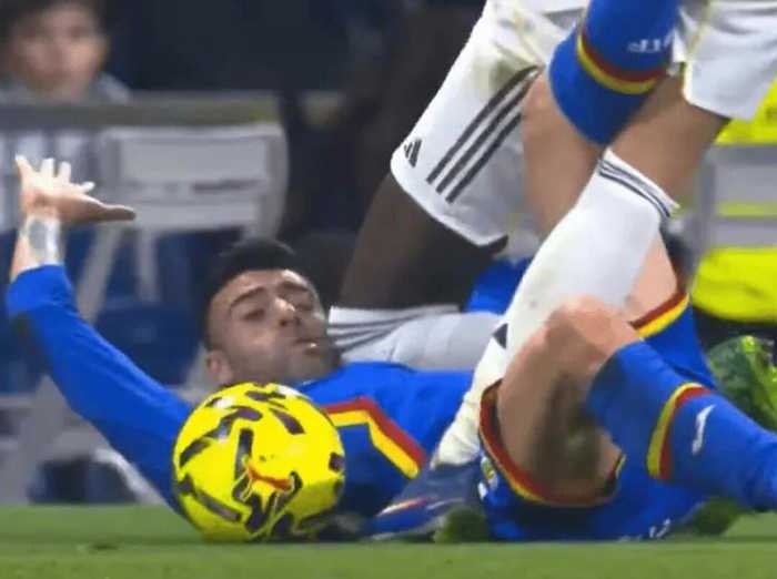 #皇马0比1赫塔费# 当地时间周一晚,在西甲第26轮皇马vs赫塔菲的比赛中,第25分钟出现争议一幕。赫塔菲后卫迭戈-里科在与居莱尔拼抢后...